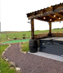 The site also features a spacious grassed area with private putting green and hot tub, ideal for families, with a charming children’s wooden play park.